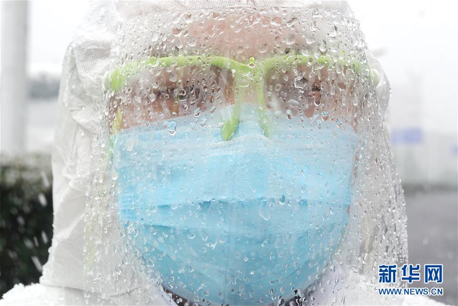 在武漢客廳方艙醫(yī)院,武漢市公安局東西湖區(qū)交通大隊(duì)快騎隊(duì)警務(wù)人員在現(xiàn)場(chǎng)執(zhí)勤。由于雨雪天氣,護(hù)目鏡上滿是霧水(2月15日攝)。 新華社記者 才揚(yáng) 攝