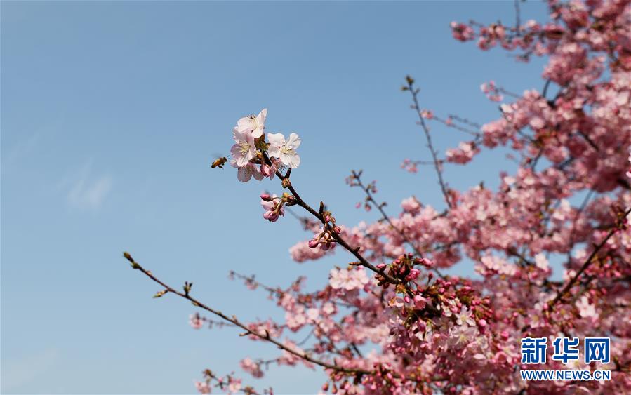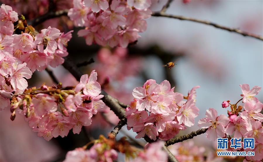 2月24日,蜜蜂在上海松江辰山植物園內盛開的河津櫻櫻花叢中飛舞。近日,上海松江區(qū)辰山植物園內的河津櫻絢麗綻放,花團錦簇間一派盎然春意。 新華社記者 方喆 攝