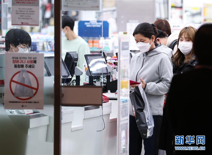 2月24日,在韓國首爾,當(dāng)?shù)鼐用裨邶埳絽^(qū)一家日用品商店排隊結(jié)賬。 新華社記者 王婧嬙 攝