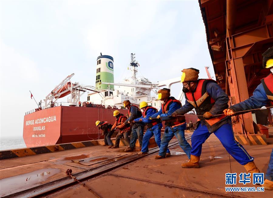 2月24日,在曹妃甸港區(qū)礦石碼頭,工人在為一艘靠岸的40萬噸級輪船拴掛纜繩。 連日來,河北省唐山港曹妃甸港區(qū)為有效防控疫情、保證安全生產(chǎn),采取對進(jìn)入港區(qū)人員檢測體溫、對車輛進(jìn)行消殺等嚴(yán)格措施,為海、陸交通暢通和物資運(yùn)輸提供保障。 新華社記者 楊世堯 攝