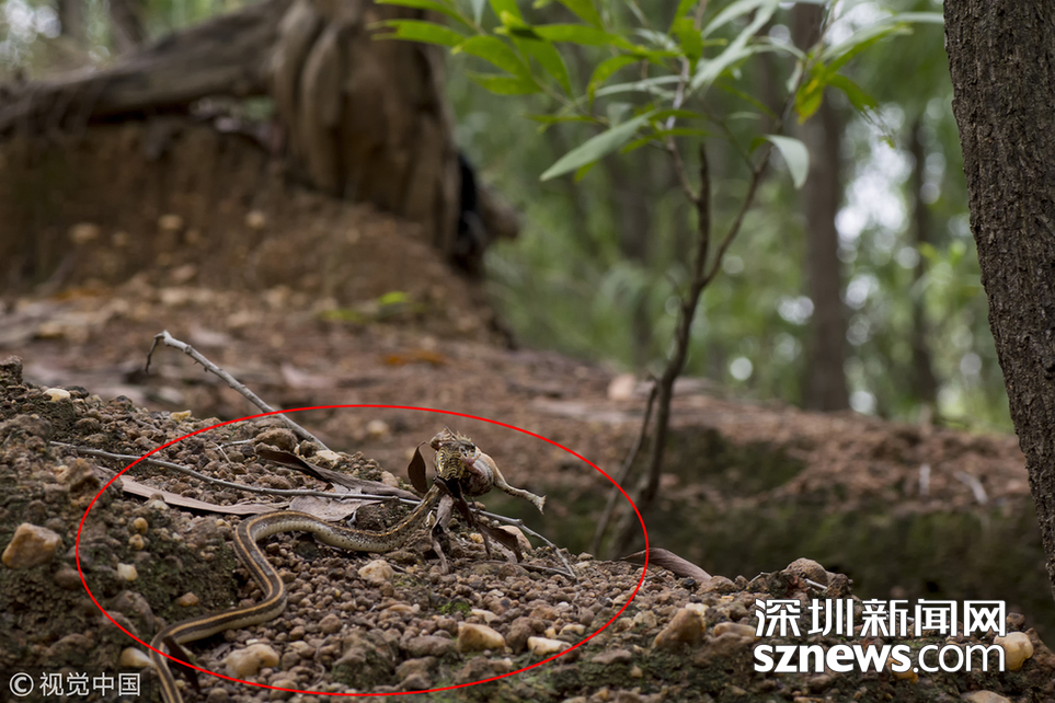 印度加爾各答B(yǎng)olpar,業(yè)余攝影師Agniswar Ghosal在Bolpar散步時(shí)拍到蛇大口吞咽蟾蜍的震撼場(chǎng)景。一條細(xì)長(zhǎng)的蛇正試圖整個(gè)吞下一只大蟾蜍,蟾蜍的頭已經(jīng)進(jìn)了蛇口,大半截身體還在外邊。這條野心勃勃的蛇把這只毫無(wú)戒心的蟾蜍從洞里拖了出來,然后溜進(jìn)灌木叢,安靜地享用晚餐。