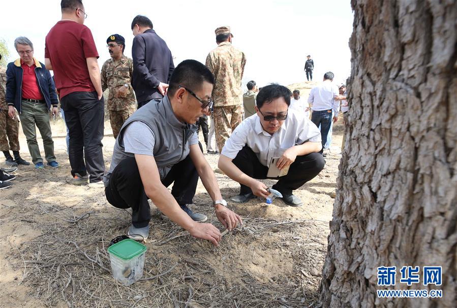 2月26日,在巴基斯坦信德省,中國(guó)蝗災(zāi)防治工作組專家采集蝗蟲(chóng)蟲(chóng)卵。新華社記者劉天攝