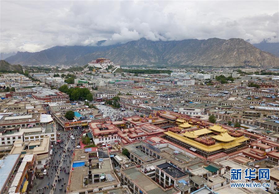 8月10日無人機拍攝的大昭寺和遠處的布達拉宮。新華社記者侯東濤攝