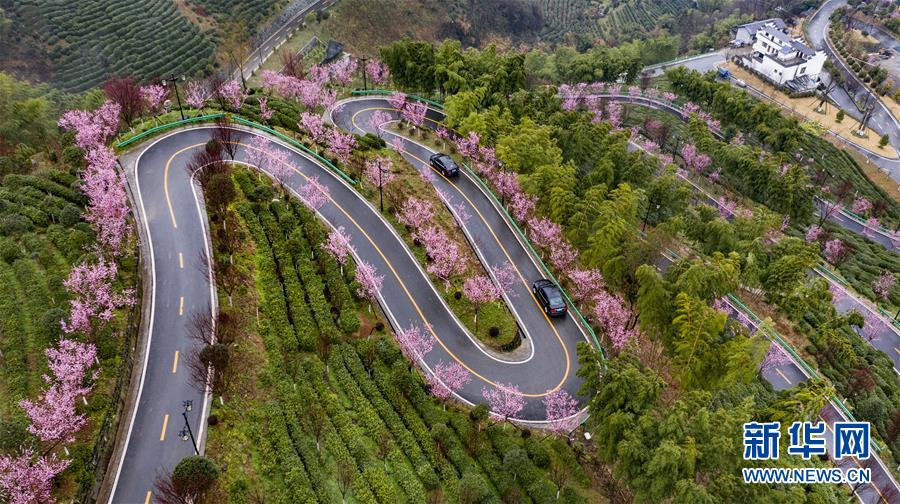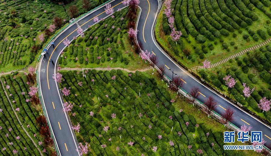 這是3月2日拍攝的平利縣長安鎮(zhèn)洪福茶山,道路兩旁的春梅盛開(無人機(jī)照片)。新華社記者陶明攝