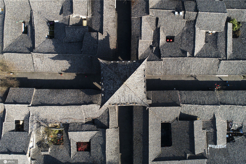 2020年2月21日,四川南充閬中古城中天樓旁,張家小院天井中的海棠在陽光中綻放(無人機(jī)拍攝)。