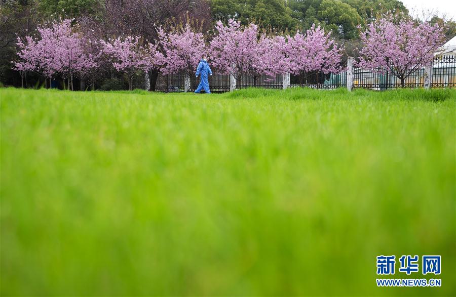 3月3日,一名工作人員從盛開的櫻花樹下走過。 新華社記者 費茂華 攝