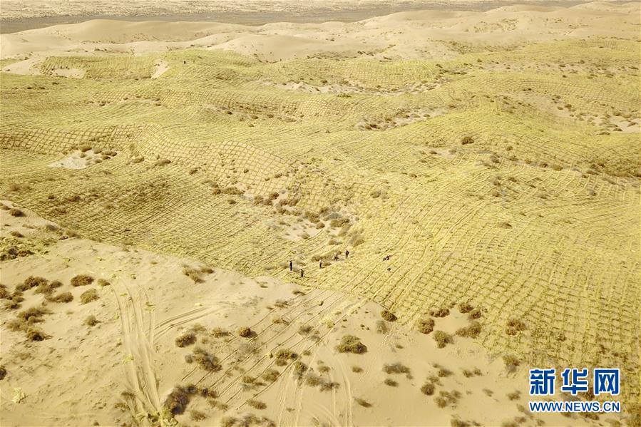 3月5日,在古浪縣北部沙區(qū)旱麻崗治沙點,群眾扎草方格壓沙(無人機照片)。初春時節(jié),在騰格里沙漠南緣的甘肅省武威市古浪縣,當(dāng)?shù)馗刹柯毠ぜ鞍瞬缴沉謭鲋紊橙斯餐诳h城北部沙區(qū)旱麻崗治沙點開展春季治沙勞動。新華社記者 范培珅 攝