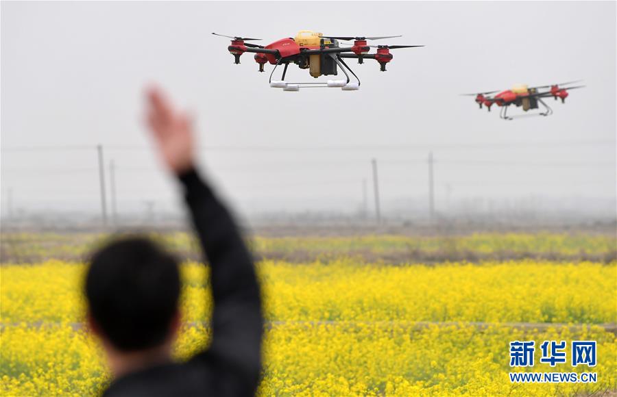 無人機在江西省南昌市南昌縣蔣巷鎮(zhèn)對油菜田進行植保作業(yè)(2月28日攝)。新華社記者 彭昭之 攝