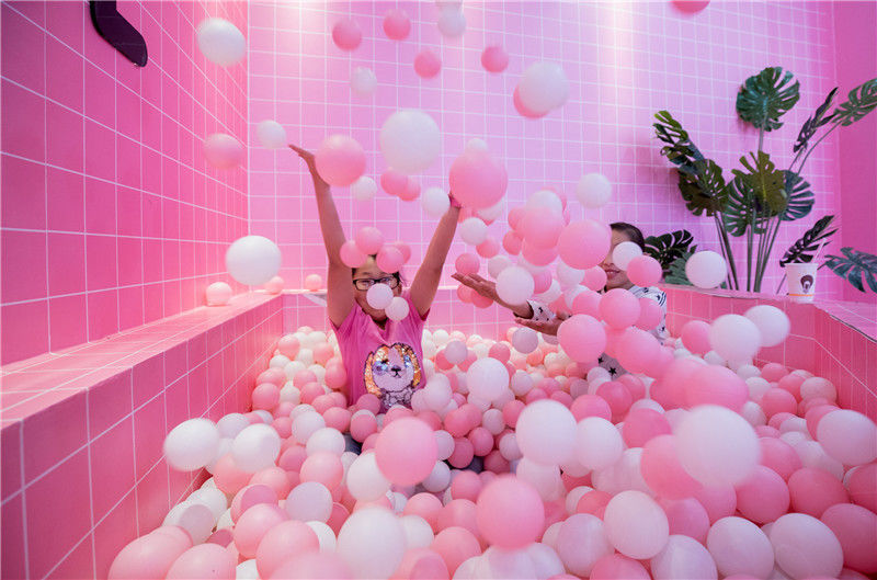 2018年9月20日,呼和浩特玉泉區(qū),市民在夢(mèng)幻love粉色小屋內(nèi)留影游玩。丁根厚/視覺中國(guó)