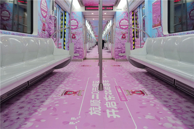 2018年4月3日,遼寧大連,伴隨濃濃春意,大連地鐵1號(hào)線、2號(hào)線、3號(hào)線、12號(hào)線櫻花專列同步上線,其中1號(hào)線為全景包列。櫻花專列車廂以粉色櫻花為基調(diào),沿枝椏延伸出的片片云霞,呈現(xiàn)春日花開意境,傳遞出北國(guó)之春的韻律。南宮傲青/視覺中國(guó)