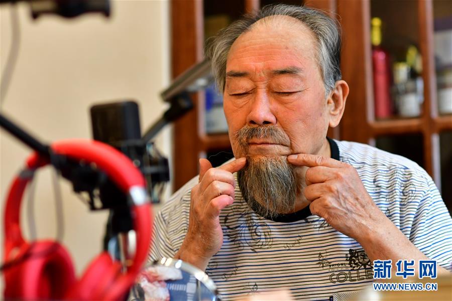 武忠在直播中為戲迷示范如何化妝(3月6日攝)。 新華社記者 曹陽(yáng) 攝