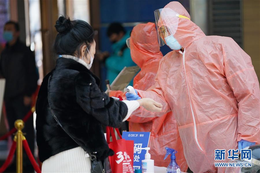 3月13日,在哈爾濱香坊萬達(dá)廣場內(nèi),工作人員在給進(jìn)店顧客測體溫。 近日,哈爾濱市多家大型商場陸續(xù)恢復(fù)營業(yè)。這些恢復(fù)營業(yè)的商場采取多種措施,從嚴(yán)細(xì)致做好疫情防控和安全風(fēng)險防范工作,為廣大顧客提供安全放心的購物空間。 新華社記者 王建威 攝