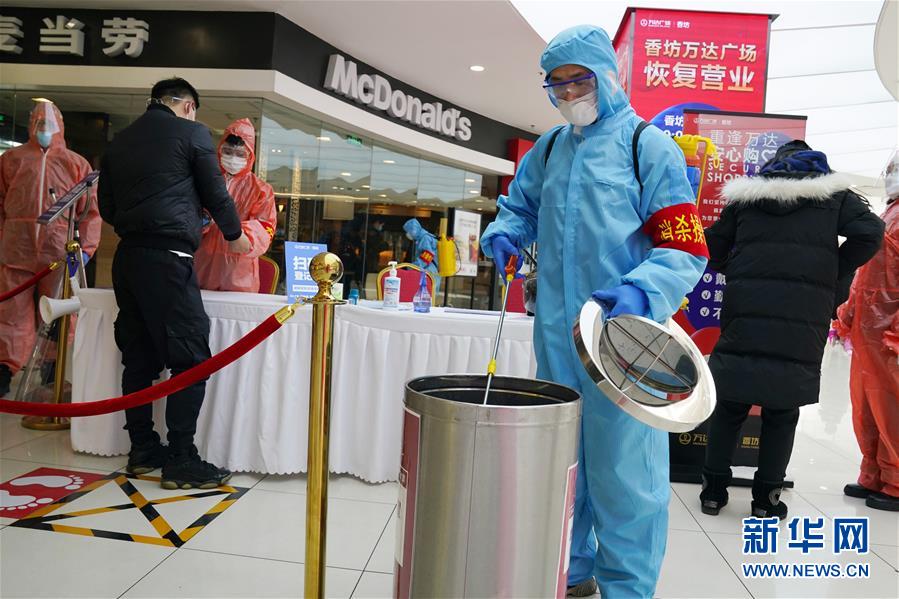 3月13日,在哈爾濱香坊萬達廣場內(nèi),工作人員在給垃圾桶消毒。 近日,哈爾濱市多家大型商場陸續(xù)恢復營業(yè)。這些恢復營業(yè)的商場采取多種措施,從嚴細致做好疫情防控和安全風險防范工作,為廣大顧客提供安全放心的購物空間。 新華社記者 王建威 攝