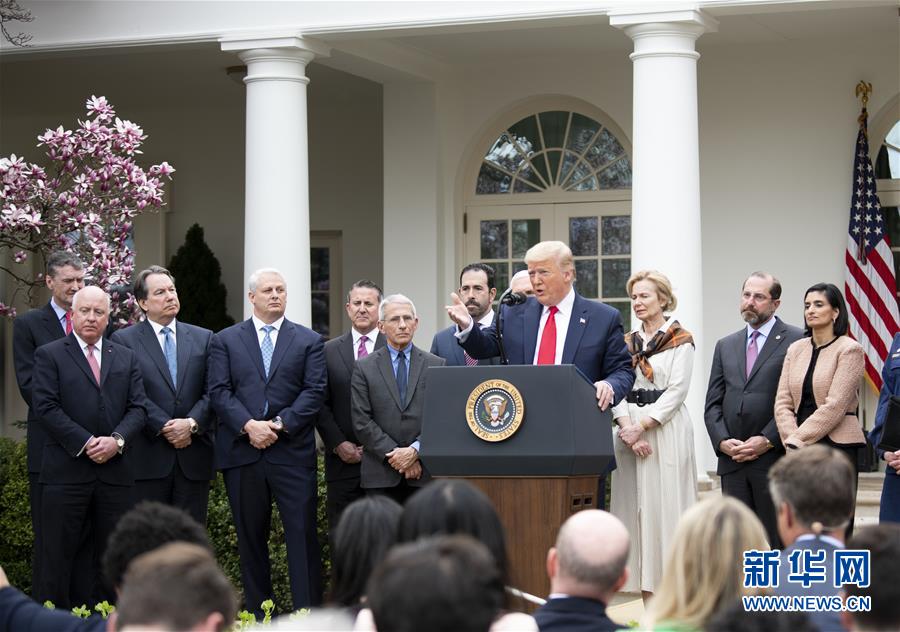 3月13日,美國(guó)總統(tǒng)特朗普(中)在華盛頓白宮的記者會(huì)上講話。特朗普當(dāng)天下午在白宮發(fā)表講話時(shí)正式宣布“國(guó)家緊急狀態(tài)”。他說,此舉旨在讓美國(guó)聯(lián)邦政府全力投入到抗擊新冠肺炎疫情的努力中。這項(xiàng)舉措將釋放500億美元資金,幫助各州和地方政府應(yīng)對(duì)疫情。新華社記者劉杰攝