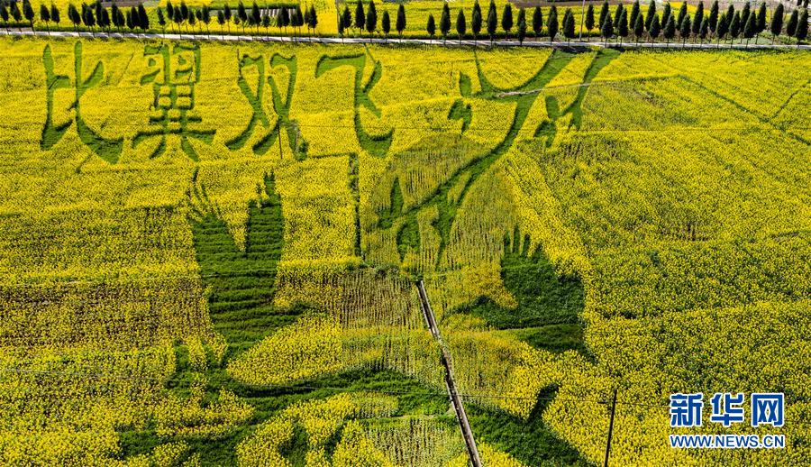 3月14日拍攝的洋縣洋州街道貫溪村創(chuàng)意種植的“比翼雙飛”油菜花景觀(無人機(jī)照片)。 新華社記者陶明攝