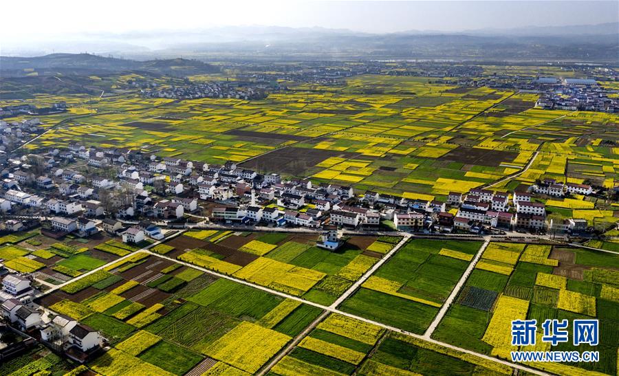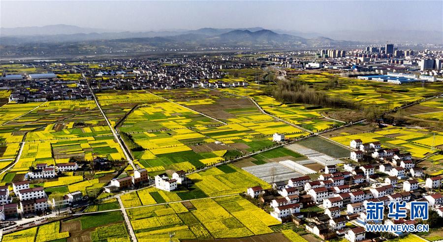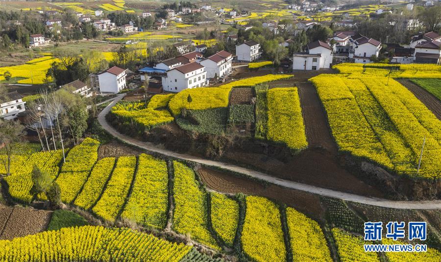 3月14日,洋縣龍亭鎮(zhèn)柳山村盛開的油菜花與村舍構(gòu)成美麗的圖畫(無人機(jī)照片)。 新華社記者陶明攝
