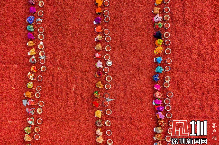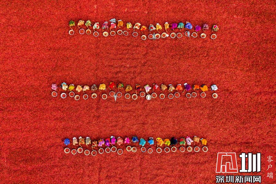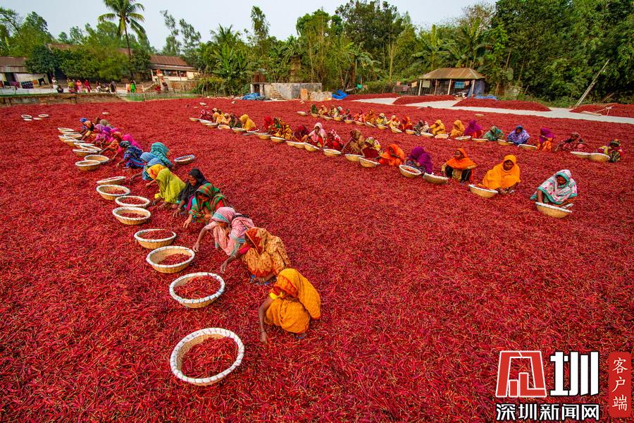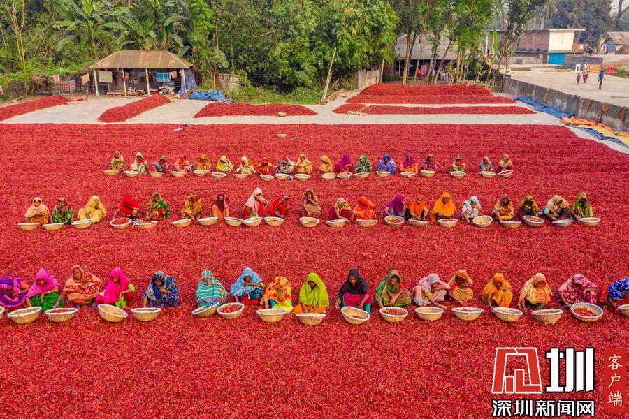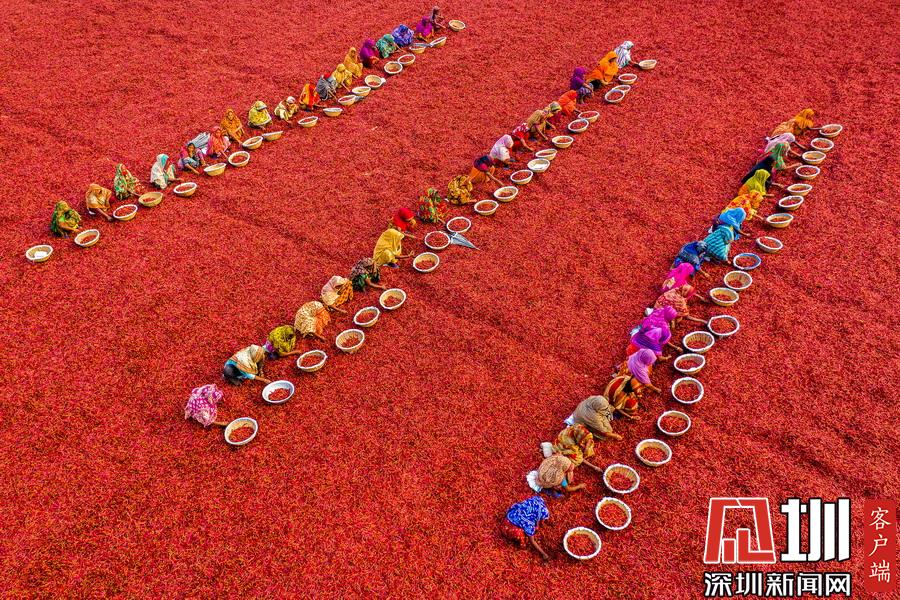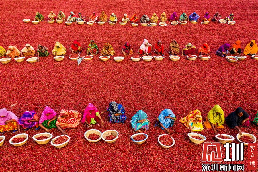 孟加拉國(guó)伯格拉,航拍穿著五顏六色衣服的工人們排列整齊的分揀辣椒。