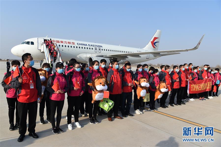 3月17日,醫(yī)療隊(duì)隊(duì)員抵達(dá)甘肅蘭州中川國際機(jī)場(chǎng)。新華社記者范培珅攝