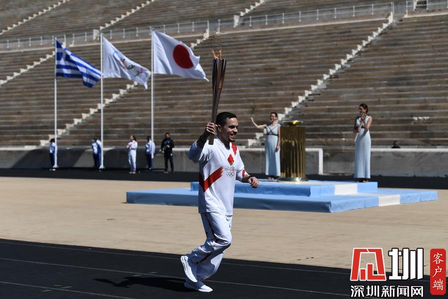 3月19日,希臘藝術體操運動員埃萊夫塞里奧斯·彼得羅尼亞斯手持圣火火炬跑入體育場。