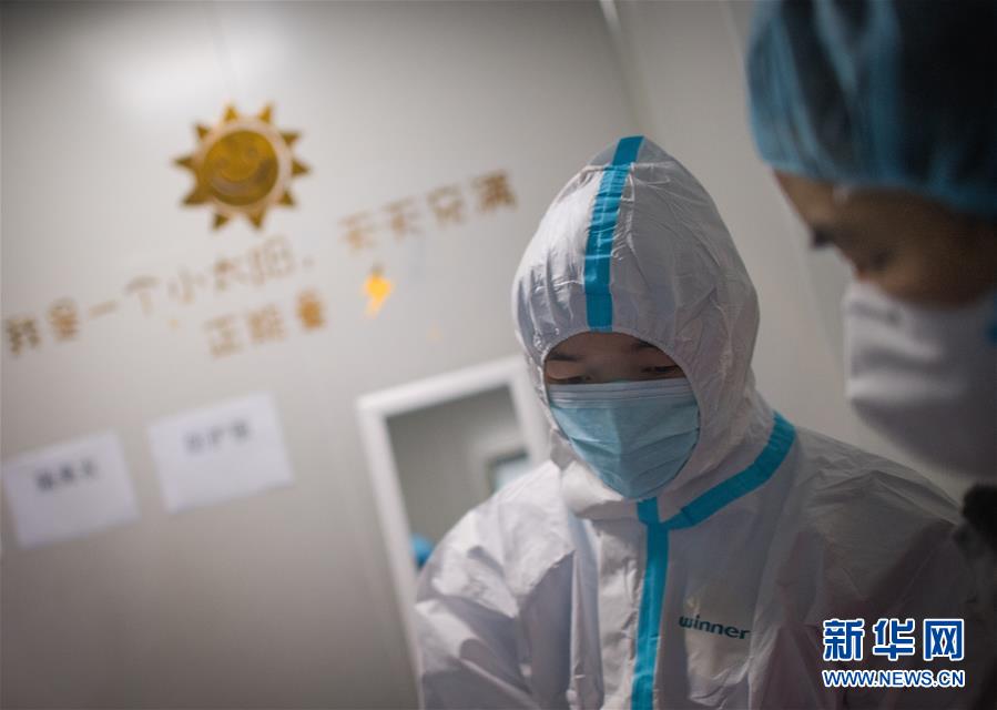 3月19日,在武漢市肺科醫(yī)院隔離病房,海南醫(yī)療隊隊員詹才露在現(xiàn)場忙碌。 新華社記者 肖藝九 攝