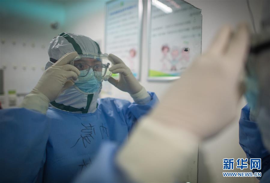 3月19日,在武漢市肺科醫(yī)院清潔區(qū),內(nèi)蒙古醫(yī)療隊隊員在穿戴護目鏡。 新華社記者 肖藝九 攝