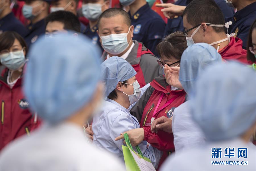 3月21日,武漢市第一醫(yī)院的醫(yī)護人員(前)送別天津市醫(yī)療隊隊員。新華社記者費茂華攝