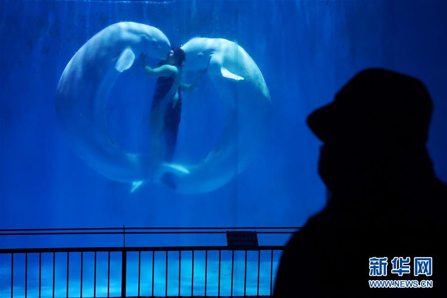 3月23日,游客在哈爾濱極地館觀賞白鯨表演。當日,哈爾濱極地館恢復(fù)營業(yè)。目前,極地館日接待人數(shù)不超過400人,園區(qū)采取分時段、間隔性辦法安排游客有序入園。游客實名預(yù)訂門票,入園要配合測溫、佩戴口罩、掃描“龍江健康碼”,刷身份證入館。新華社記者王建威攝