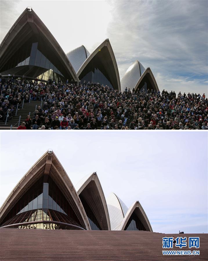 拼版照片顯示:(上)2019年6月14日,大量市民坐在澳大利亞悉尼歌劇院前的臺階上。(下)2020年3月24日,澳大利亞悉尼歌劇院前的臺階上空空蕩蕩。澳大利亞從當(dāng)?shù)貢r間3月23日中午起,關(guān)閉影院、室內(nèi)體育館、健身房等文體娛樂場所,飯店和咖啡館只允許外賣業(yè)務(wù)。 新華社記者 白雪飛 攝