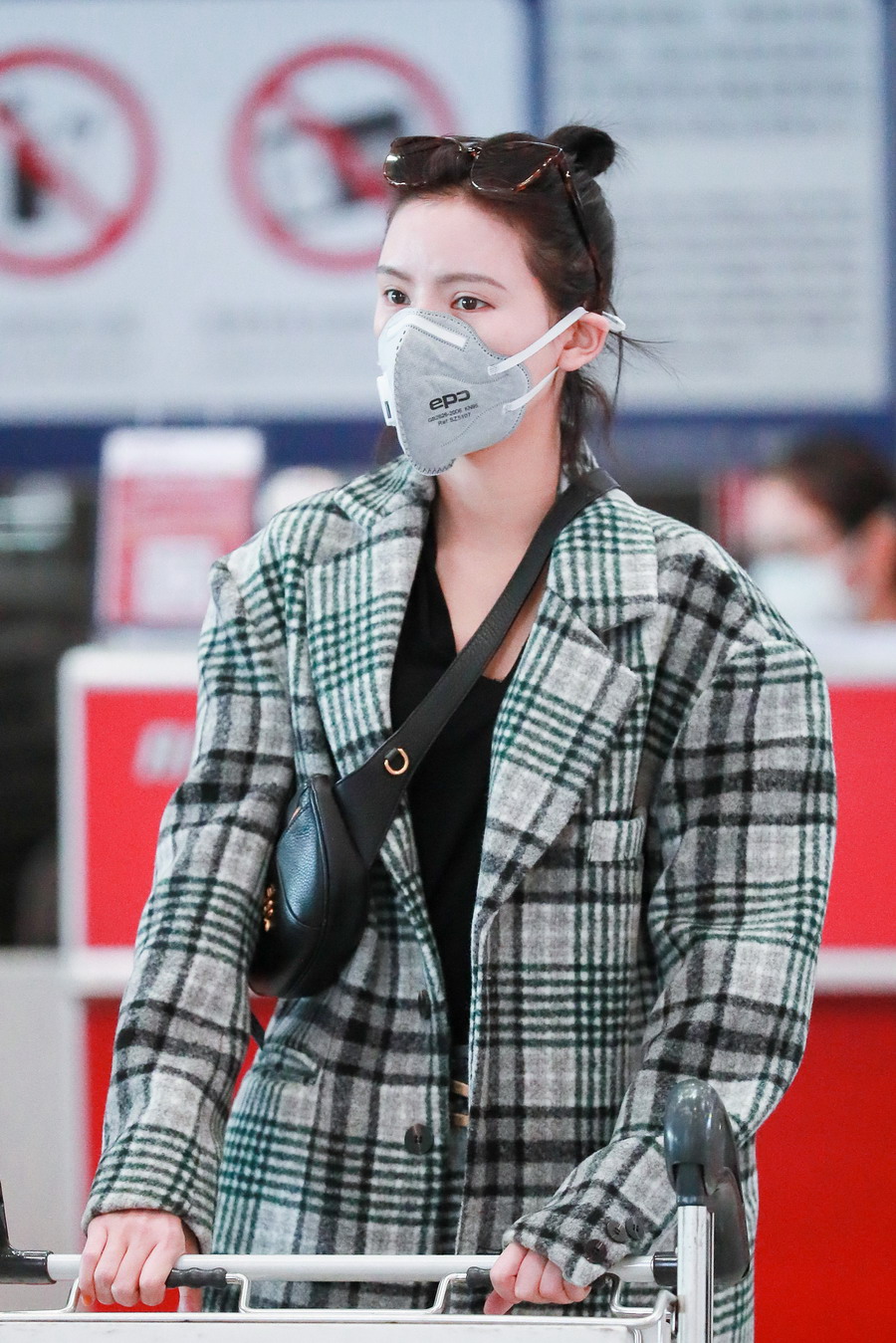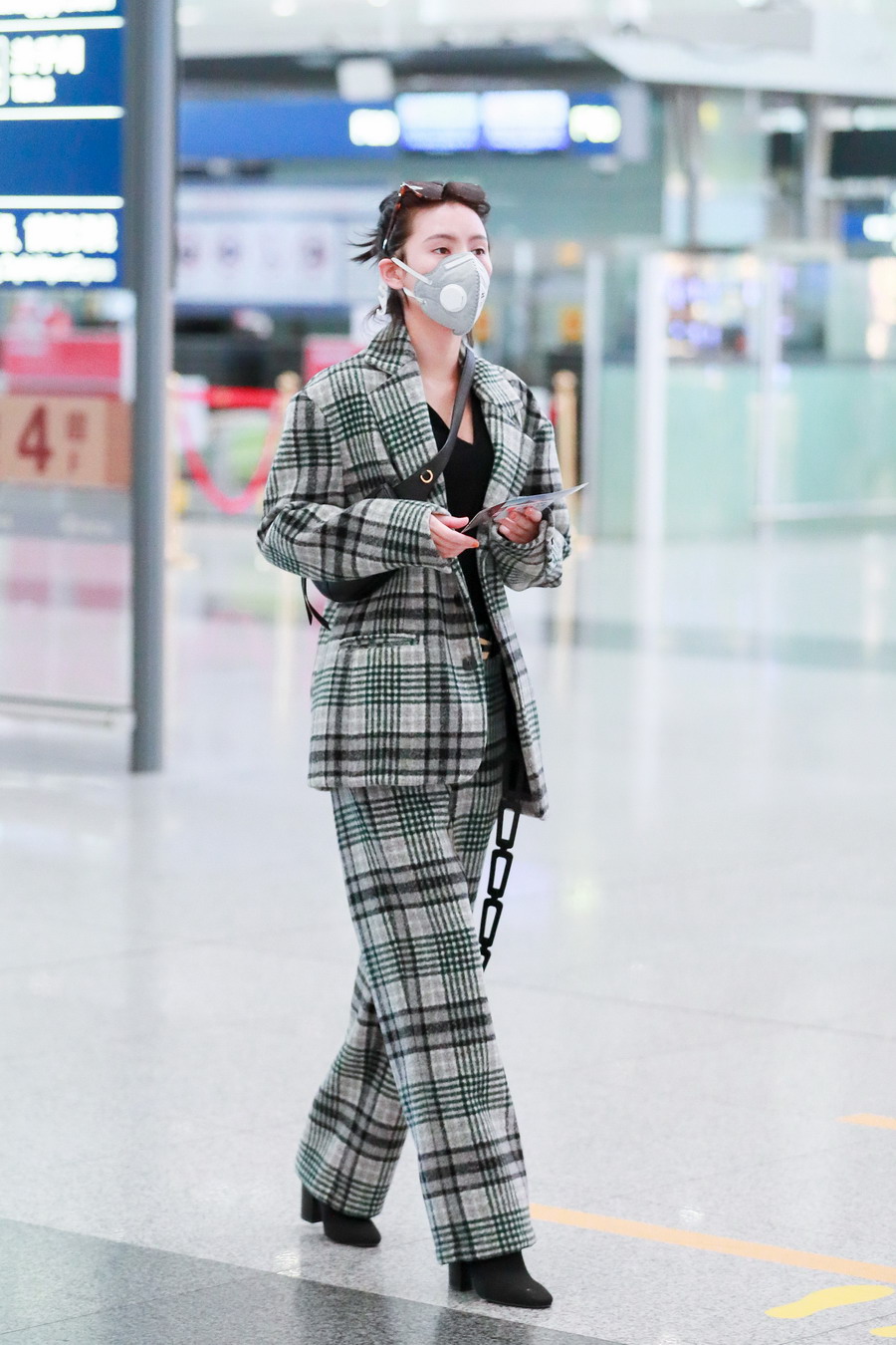 張予曦扎丸子頭穿格子西裝又美又颯 搭配斜挎小包潮范十足