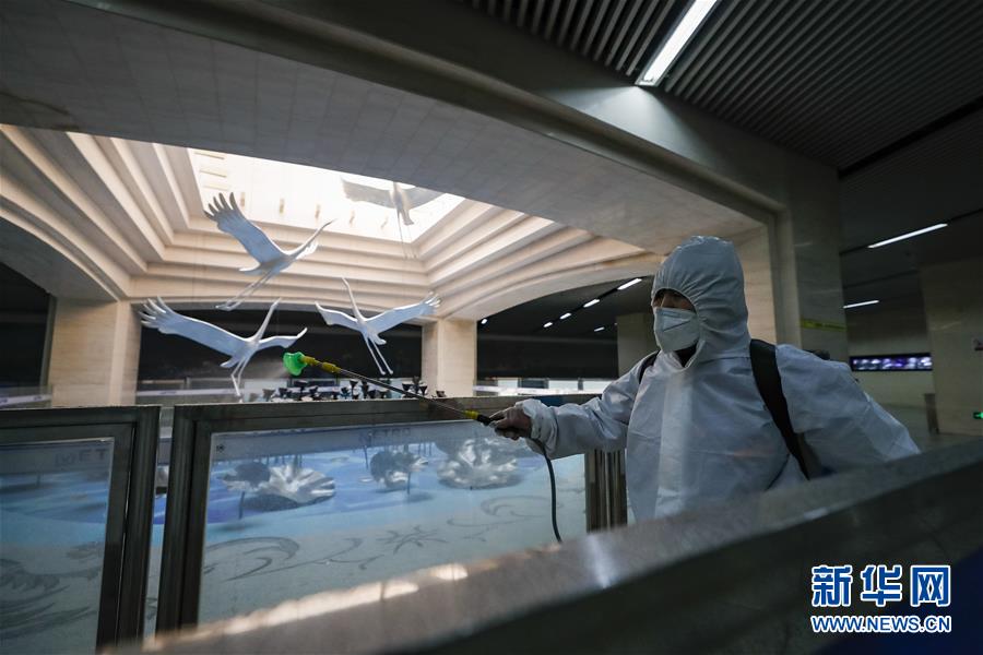 3月23日,在漢口火車站地鐵站,保潔人員在為站廳乘客通道消毒。目前,武漢城市功能和市民生活正逐步有序恢復(fù),地鐵、公交車系統(tǒng)已啟動(dòng)全面消殺和張貼乘客健康二維碼識(shí)別等舉措,為恢復(fù)運(yùn)營做準(zhǔn)備。新華社記者沈伯韓攝