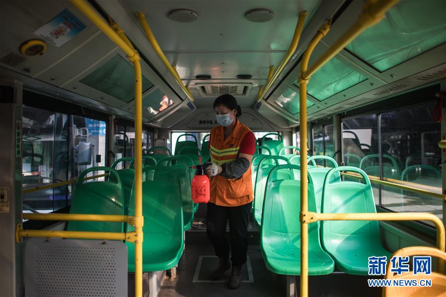 3月23日,在武昌火車站公交車總站,武漢公交集團站務(wù)公司保潔員趙真香在為一輛公共汽車消毒清洗。新華社記者肖藝九攝