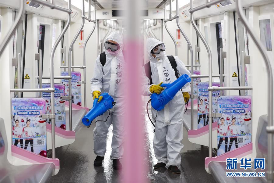 3月23日,在武漢地鐵常青車輛段,保潔人員為地鐵列車消毒。新華社記者沈伯韓攝