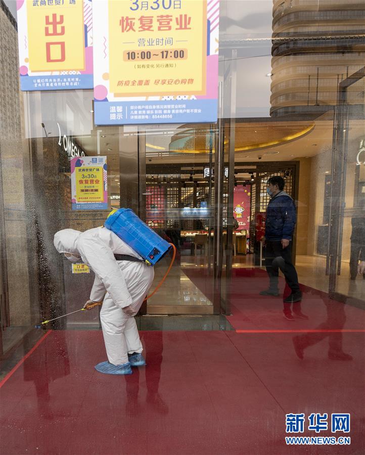 3月30日,在武商世貿廣場,工作人員在開門前進行最后的消殺工作。當日,武漢市多家商場開門迎客。新華社記者費茂華攝