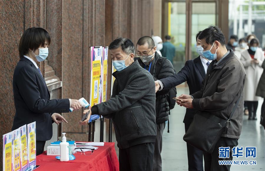 3月30日,在武商世貿(mào)廣場,工作人員在為顧客測量體溫。當日,武漢市多家商場開門迎客。新華社記者費茂華攝