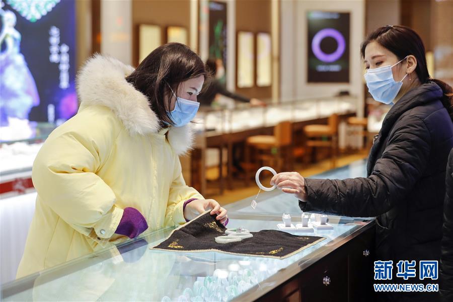 3月30日,在武漢市武商世貿(mào)廣場(chǎng),一名顧客(左)在挑選手鐲。當(dāng)日,武漢市多家商場(chǎng)開(kāi)門迎客。新華社記者沈伯韓攝