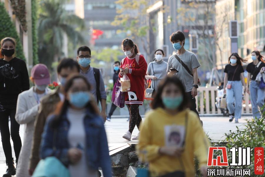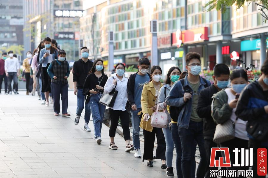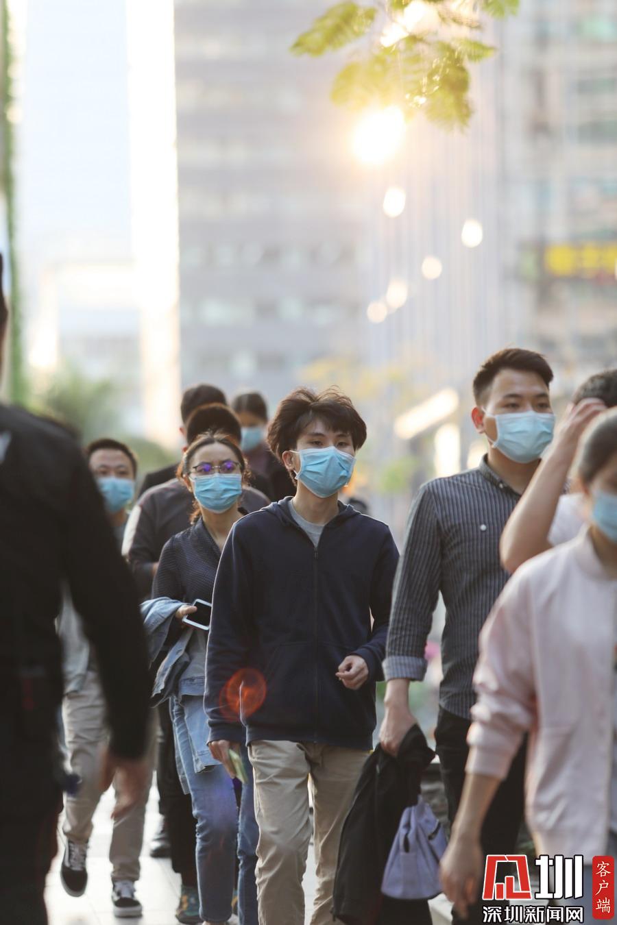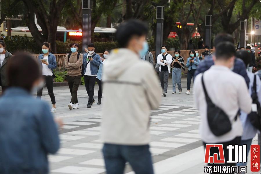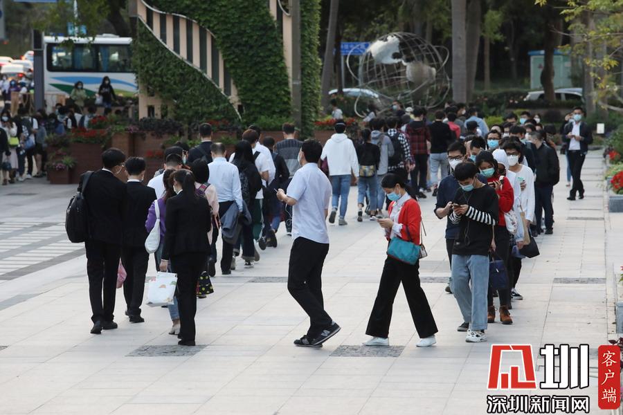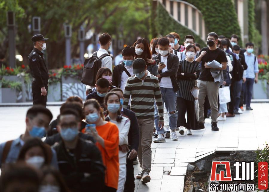 見圳客戶端·深圳新聞網(wǎng)2020年3月19日訊 下班時(shí)間,深圳地鐵一號線深大站A3出口外,下班后的市民在站外排大排長龍,依次有序進(jìn)入地鐵站乘坐列車回家。