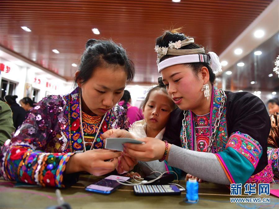 村民在廣西融水苗族自治縣易地扶貧安置點苗家小鎮(zhèn)“婦女之家巾幗扶貧車間”學(xué)習(xí)刺繡(2019年11月18日攝)。新華社記者黃孝邦攝