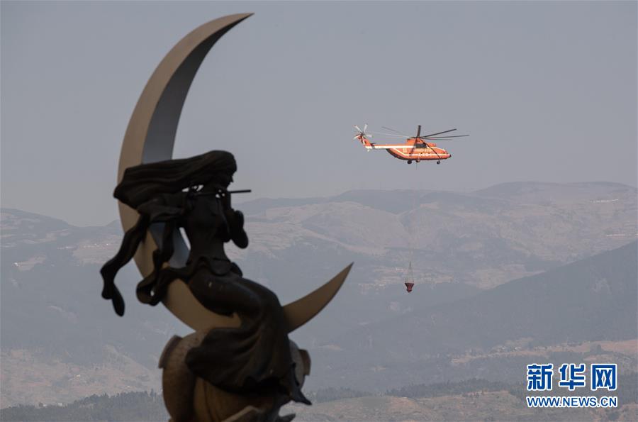 3月31日,一架參與西昌森林火災(zāi)滅火的直升機(jī)在邛海中取完水飛向火場(chǎng)。新華社記者江宏景攝