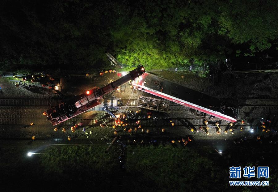3月31日,工程車輛在T179次客運列車脫軌現(xiàn)場作業(yè)(無人機照片)。新華社發(fā)(陳振海攝)