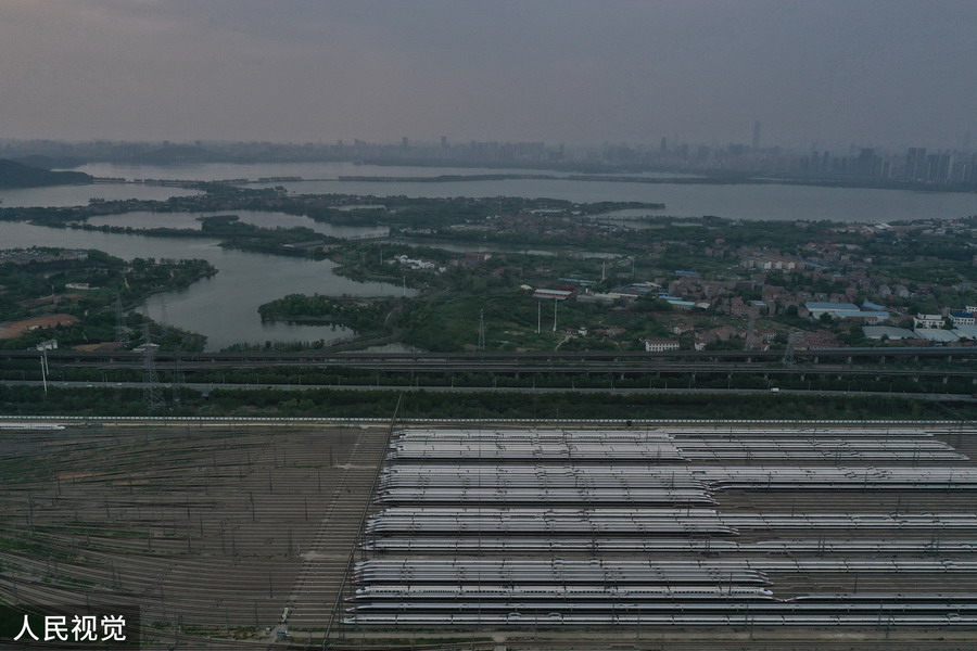 2020年4月6日,武漢動車段高鐵動車組整裝待發(fā)(無人機(jī)照片)。