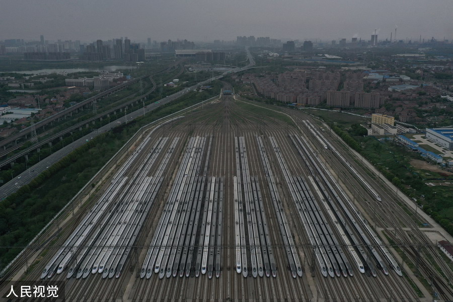 2020年4月6日,武漢動車段高鐵動車組整裝待發(fā)(無人機(jī)照片)。