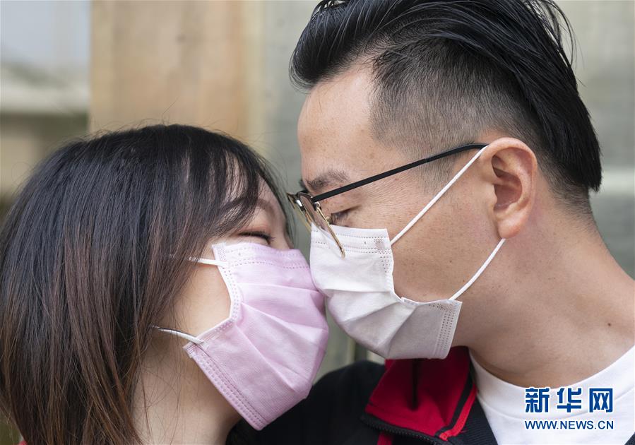 4月7日,在武漢市江岸區(qū)民政局婚姻登記處,陳先生與張女士隔著口罩親吻。 新華社記者才揚(yáng)攝