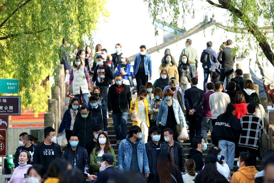 2020年4月5日,上海。清明小長(zhǎng)假第二天,上海各景點(diǎn)客流攀升,游客戴口罩有序出游,踏春、防疫兩不誤。在上海千年古鎮(zhèn)七寶老街看到游客川流不息、人頭攢動(dòng)。古鎮(zhèn)在各入口做好防疫措施、控制客流量。
