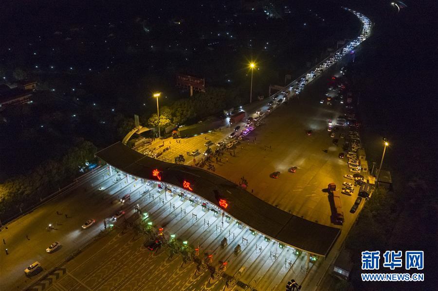 4月8日凌晨,車輛通過武漢西高速收費(fèi)站(無人機(jī)照片)。 新華社記者 沈伯韓 攝