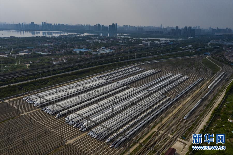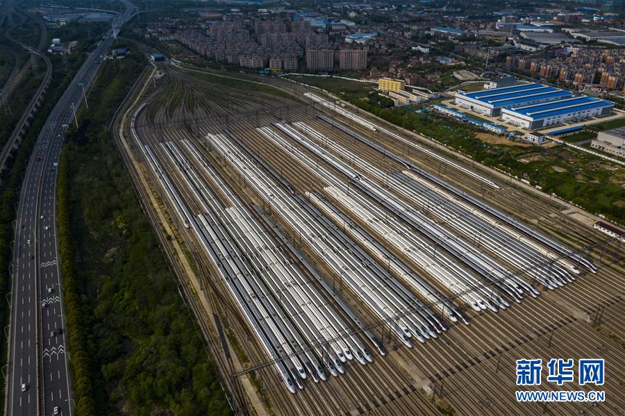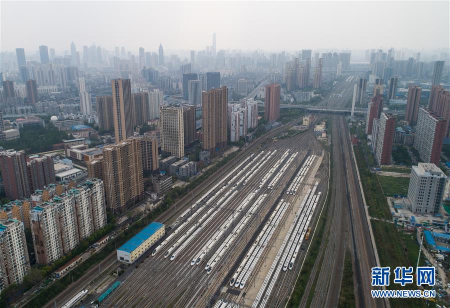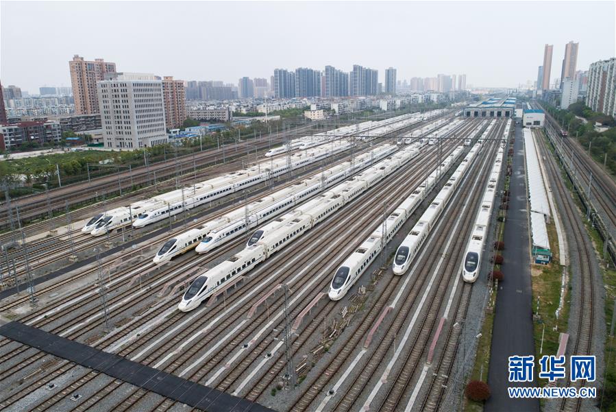4月7日,在武漢動(dòng)車段,列車停靠在存車線上(無人機(jī)照片)。 新華社記者 肖藝九 攝