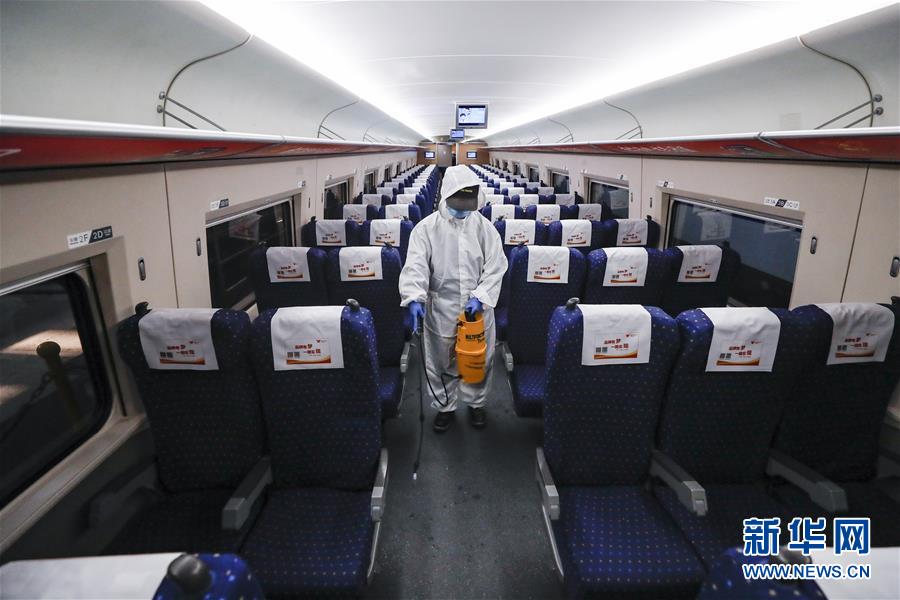 4月7日,武漢動(dòng)車段運(yùn)用車間工作人員周明輝在給列車消毒。 新華社記者 沈伯韓 攝
