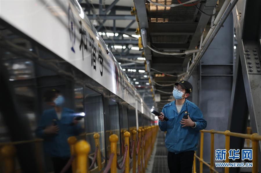 4月7日,武漢動(dòng)車段運(yùn)用車間綜合檢修班工長楊磊在檢查車輛情況。 新華社記者 沈伯韓 攝