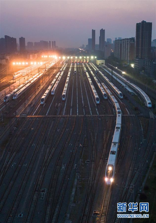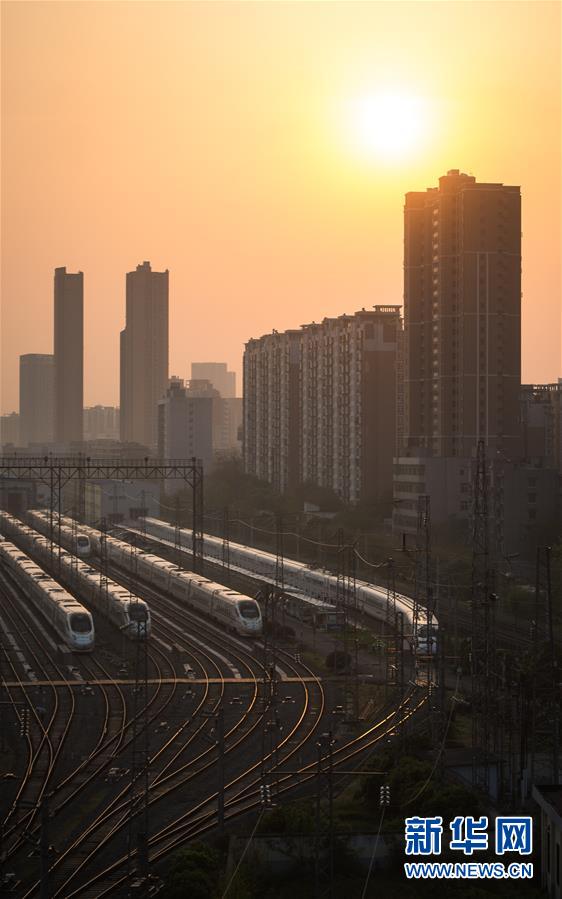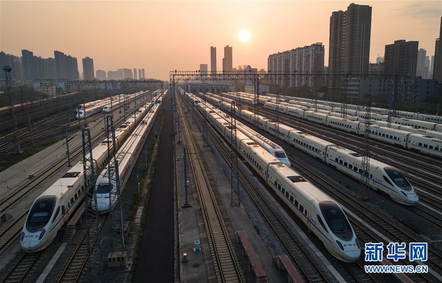 4月8日,在武漢動(dòng)車(chē)段,列車(chē)停靠在存車(chē)線上準(zhǔn)備投入運(yùn)行。 新華社記者 肖藝九 攝