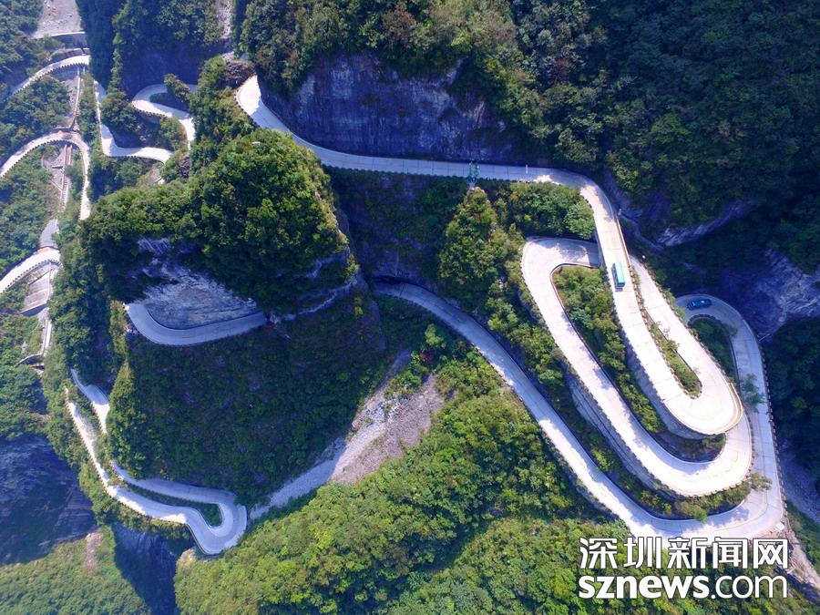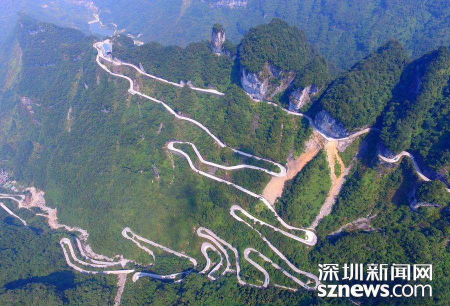 天門山盤山公路位于湖南省張家界市境內(nèi)的國(guó)家森林公園天門山上,盤山公路全長(zhǎng)10.77公里,海拔從200米急劇提升到1300米,大道兩側(cè)絕壁千仞,空谷幽深,共計(jì)99個(gè)彎,180度急彎此消彼長(zhǎng),似玉帶環(huán)繞,航拍鏡頭下蜿蜒曲折的道路彎彎緊連,層層迭起,宛如迷宮般的“納斯卡線條”,被譽(yù)為“天下第一公路奇觀”,同時(shí)它也是世界上最危險(xiǎn)的十大公路之一。
