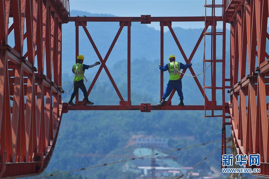 中老鐵路施工忙在位于普洱市的木乃河雙線特大橋工程現(xiàn)場,工人鐘琪(左)和馮壯在進(jìn)行架橋機(jī)前橫聯(lián)螺絲檢查及二次緊固(4月12日攝)。新華社記者秦晴攝